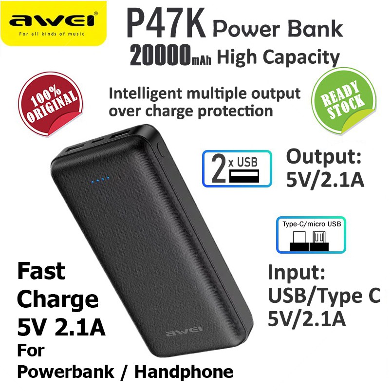 Awei P47k 20000 Mah Power Bank Inputs Micro Usb And Type C 2 1a Dual Outputs 2 1a Fast Charger Powerbank Shopee Singapore